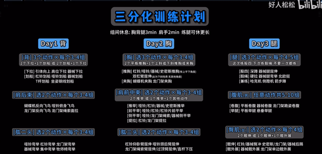 同理可知,三分化训练:背+肩后束+肱二头、胸+肩前中束+肱三头、腿、(腹)